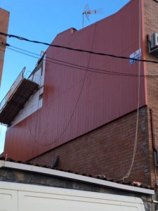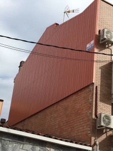 Revestido con placas de acero galvanizado y prelacado en acabado grecado, en rojo teja elegido por nuestro cliente, las placas tienen unas dimensiones de 2500x570mm y de grosor 0,6mm colocadas mediante sus respetivas omegas que es una estructura metálica galvanizada, también compuesto de aislante con placas de poliestireno extrusionado de 40mm de grosor y una densidad de 35Kg y sus correspondientes rematadas para la finalización del mismo.
